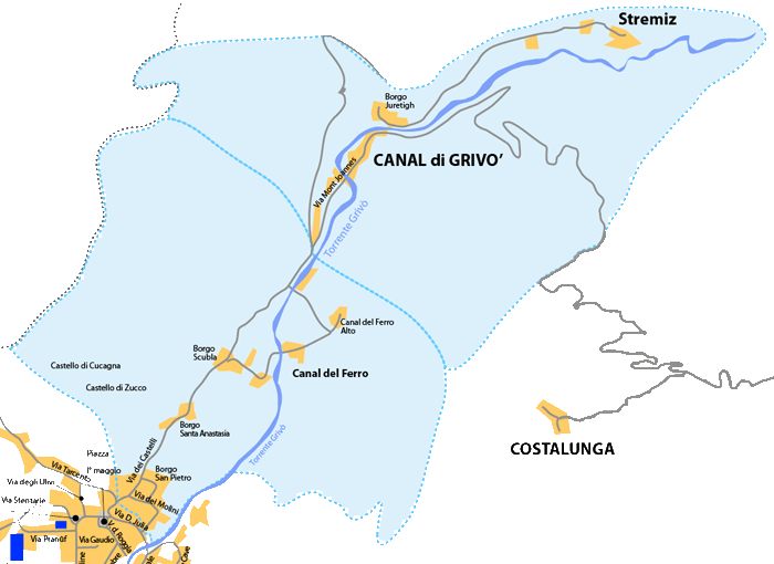 IL TERRITORIO: Borgo San Pietro, Via dei Castelli, Via Dei Molini, Borgo Scubla, Canal del Ferro, Canal di Grivò, Stremiz